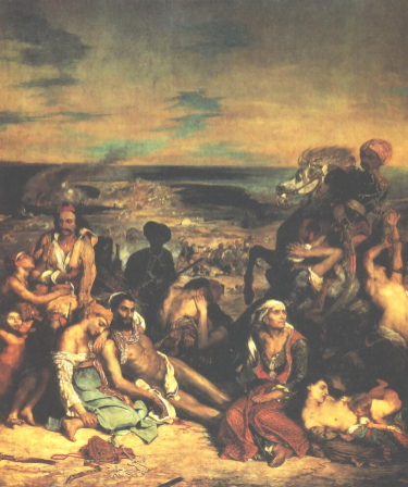 The Massacre at Chios (French: Scène des massacres de Scio) is the second major oil painting by the French artist Eugène Delacroix. The work is more than thirteen feet high, and shows some of the horror of the wartime destruction visited on the Island of Chios. A frieze-like display of suffering characters, military might, ornate and colorful costumes, terror, disease and death is shown in front of a scene of widespread desolation. The painting was completed and displayed at the Salon of 1824 and presently hangs at the Musée du Louvre in Paris.